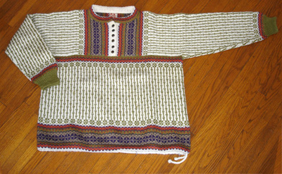 This seamless sweater starts with a yoke that also forms the sleeves. There is a buttoned placket and narrow, stand up collar. I picked up the body stitches between the sleeves of the yoke, and knit down to the lower edge. The bottom is finished with a hem that contains a draw string. The yarn is a DK weight wool/mohair blend.