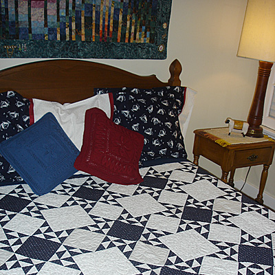 I’ve dressed up my bedroom for the holidays. My new quilt (Lincoln Star) is finished so I paired it with new, navy blue flannel sheets. The pillow slips were sewn by Darlene, one of my knitting students. I love the touch of red she added to the cuffs. The small pillows are samples from one of the fall knitting classes that I taught at Sarah Jane’s. They are variations of the heirloom counterpane pattern. The bargello quilt wall hanging above the bed was made by my daughter,