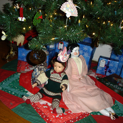 Almost at the top of the tree, tied to a big limb, was a beautiful doll. Her china head with painted hair glistened in the candle light. The Sunflower was sure the doll’s blue eyes were looking directly at her.